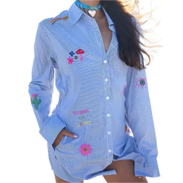 100% Lightweight Cotton button-down shirt dress with good vibes embroidery, pockets, and a waist tie that can be tied in the front or back.