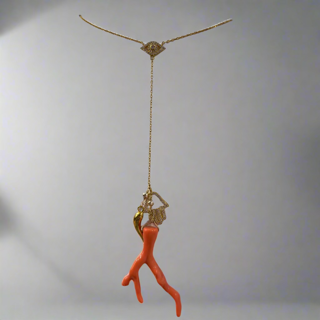 Gold chain with drop pendants (coral branch, hamsa and, horn)