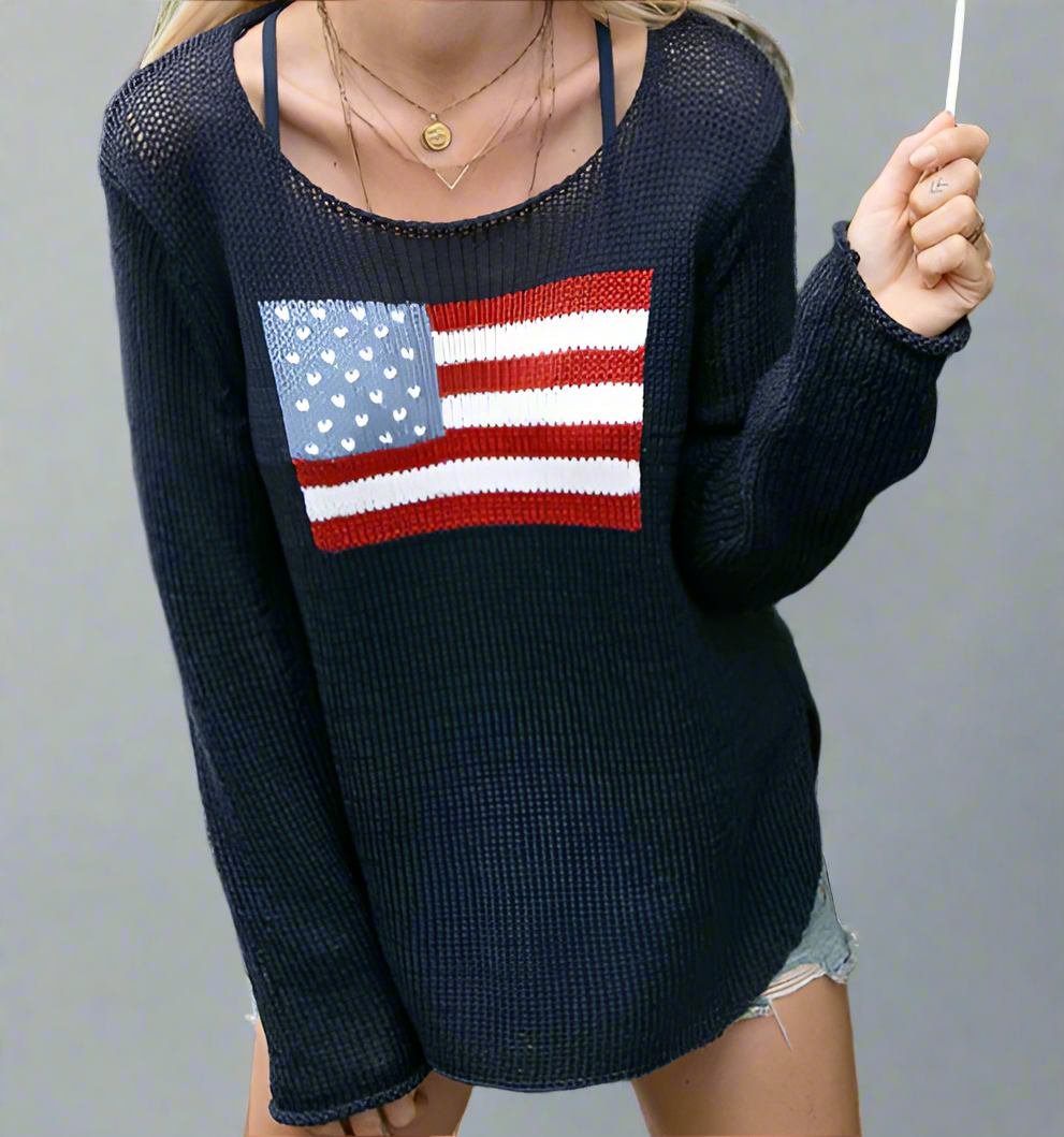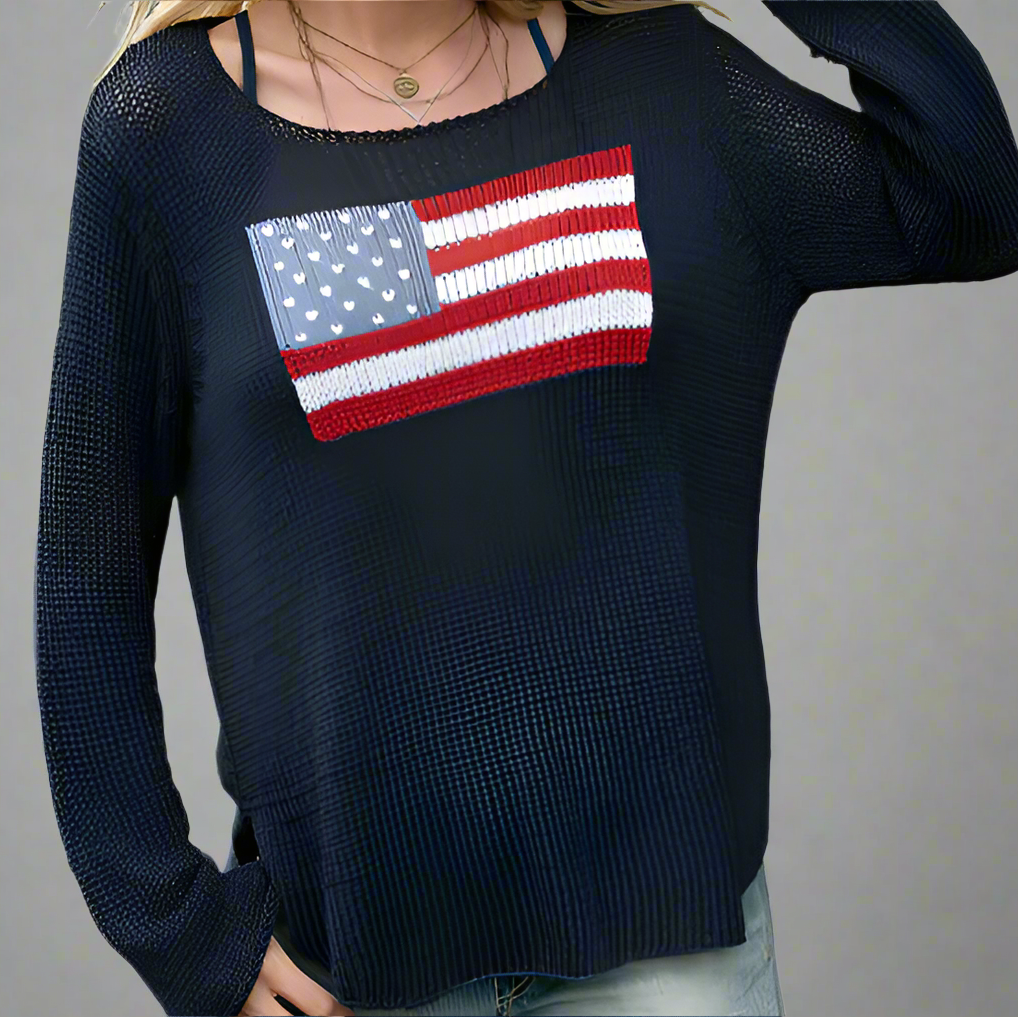 Knit using our soft, ropey and breathable cotton blend yarn, this crew neck has a flattering, relaxed fit. An American flag graphic is knit directly into the center front. Details include a rounded hem with side slits, making this top super versatile.