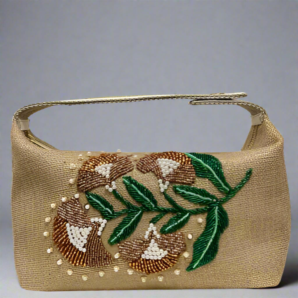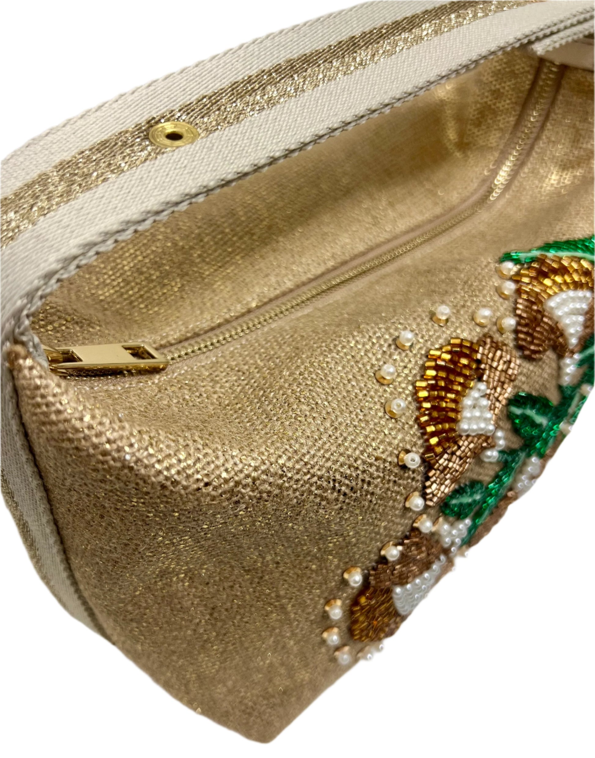 Shiny gold clutch bag with hand beaded flower design ....White and gold mesh snap handle with zipper closure.