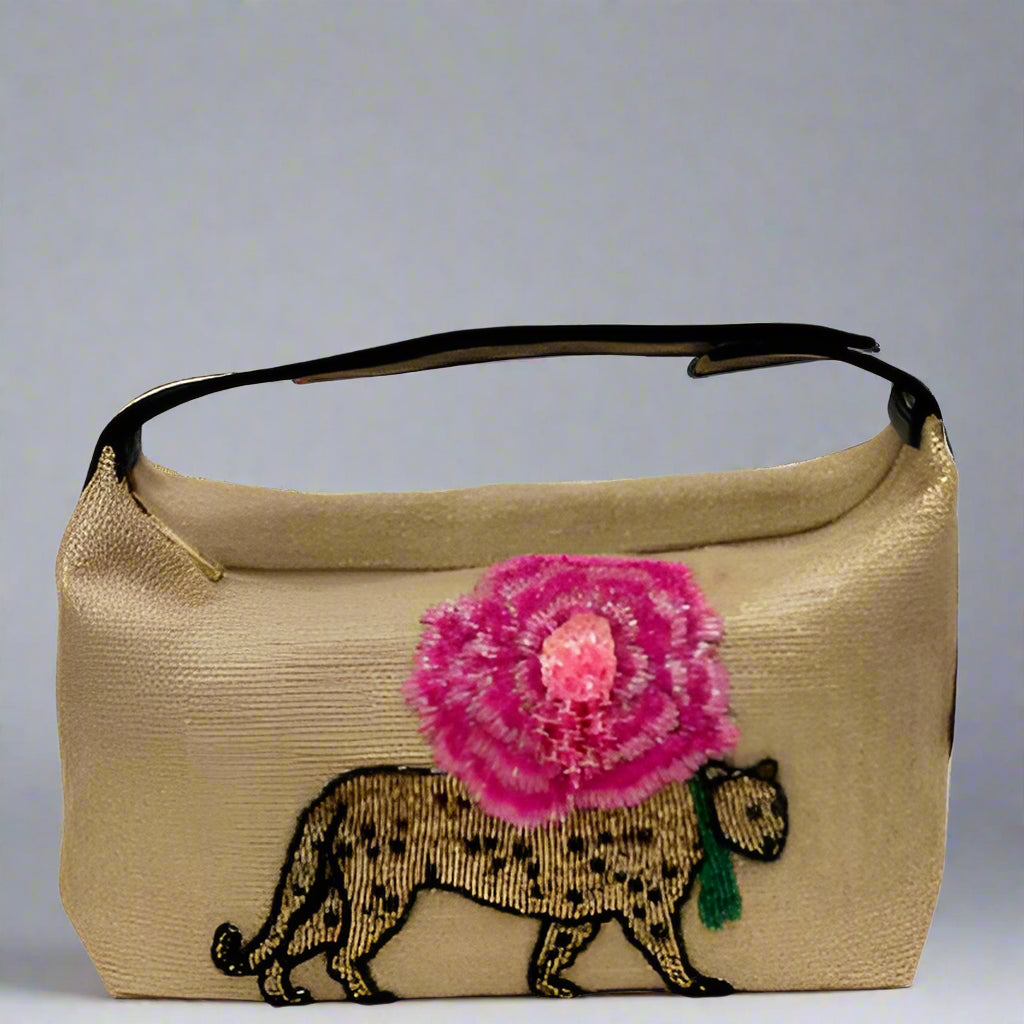 Shiny gold clutch bag with hand beaded tiger design with flower in front... black and gold mesh snap handle with zipper closure.