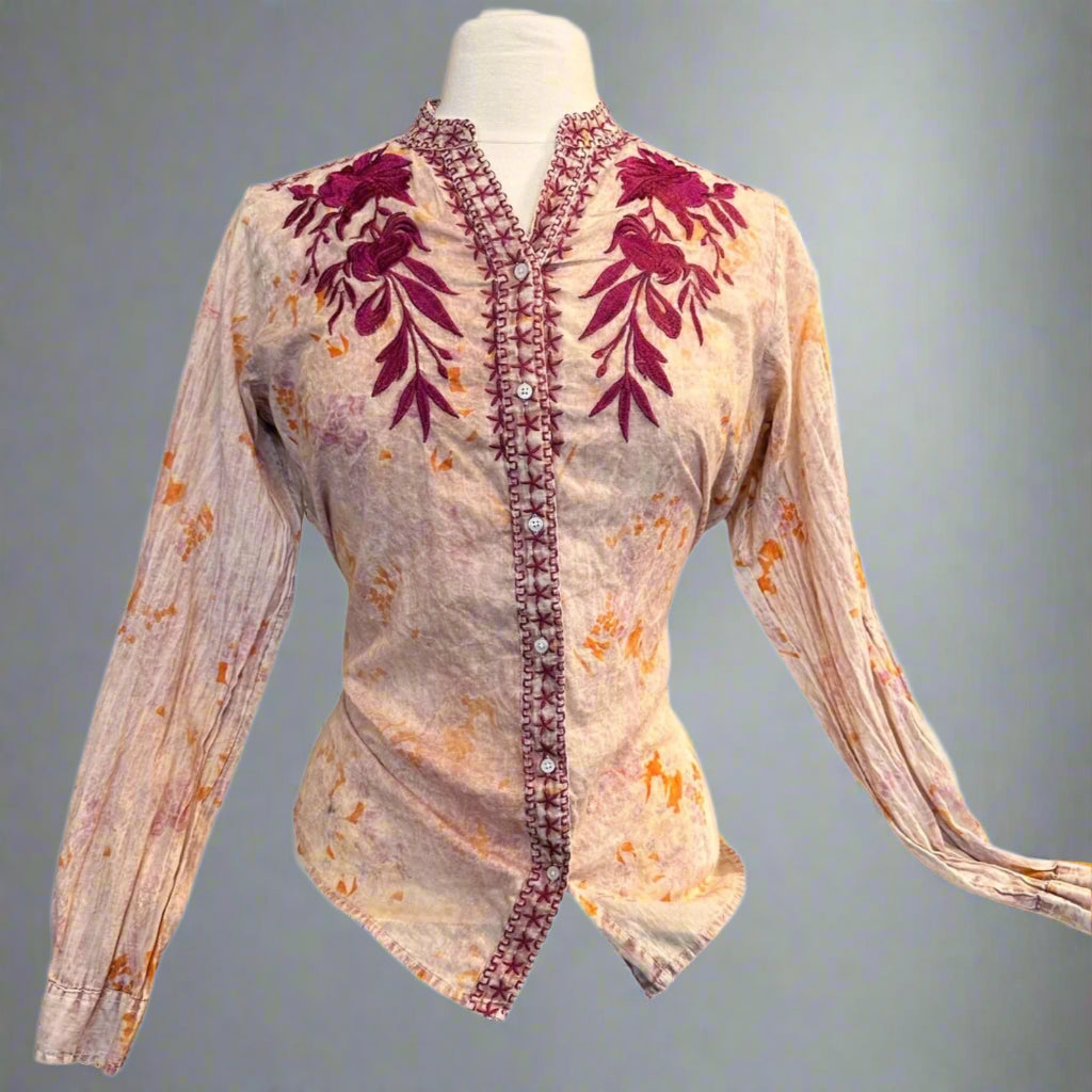Lavender and orange vintage washed blouse with claret color embroidered details