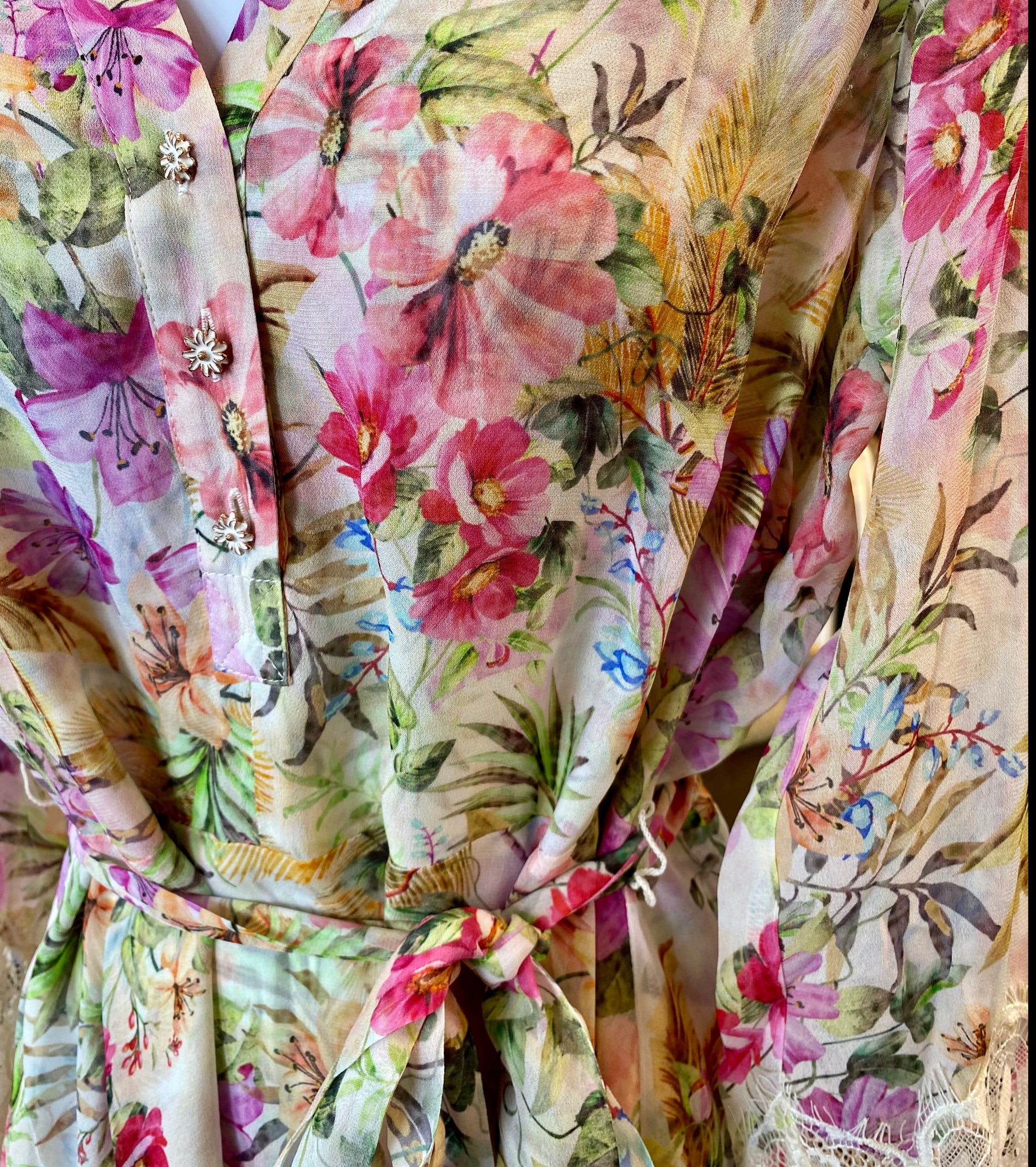 - Washed georgette (100% Rayon) Body is lined (100% viscose). Lace detailing throughout body. Short placket at front with buttons. Long sleeve with smocked cuff.