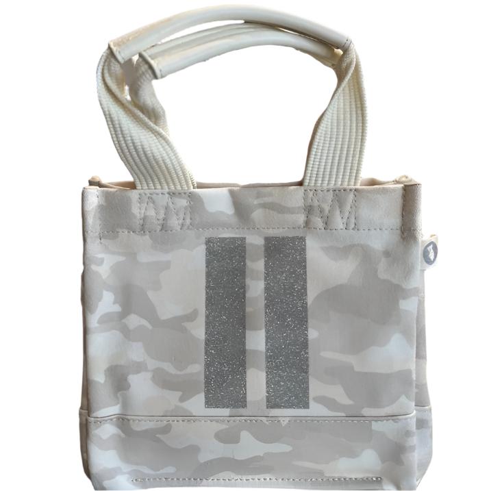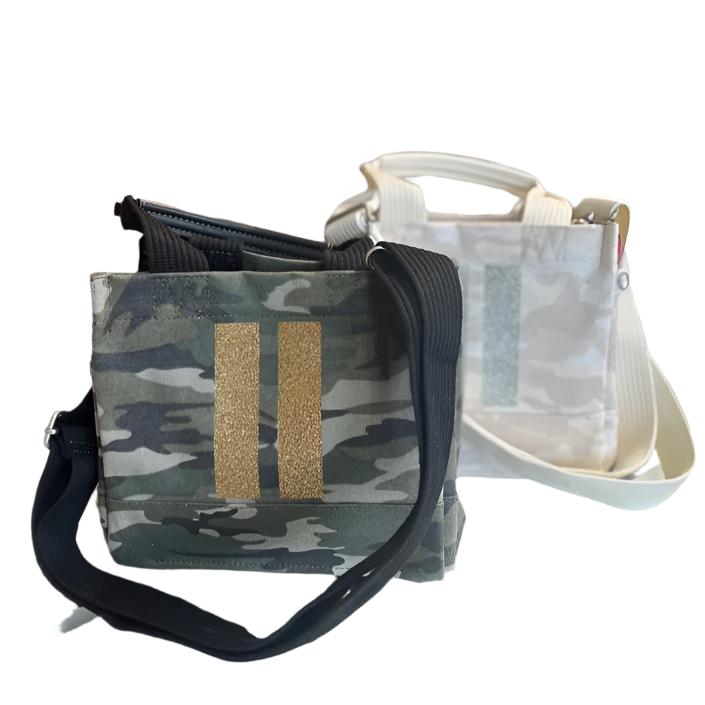 This tote has two inside pockets (one with zipper), an adjustable crossbody strap, feet on the bottom, and two outside pockets. It has a hearty snap at the top and two on the side.