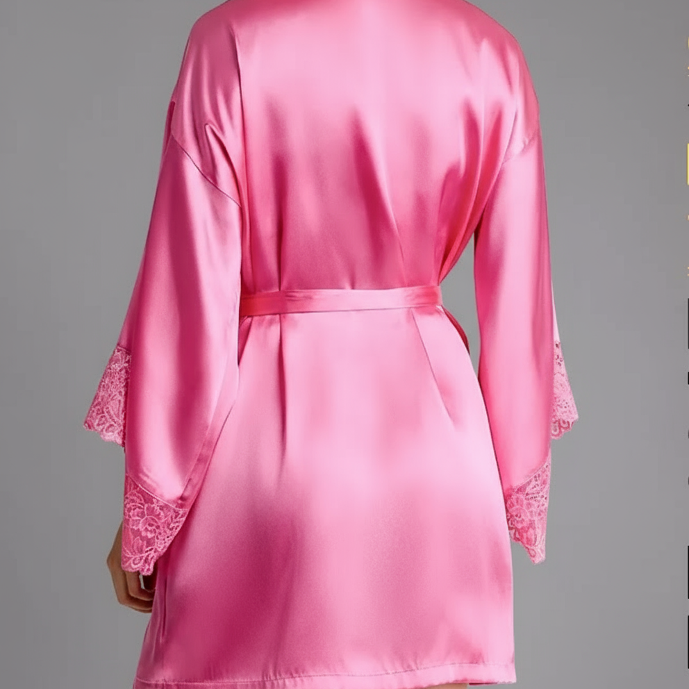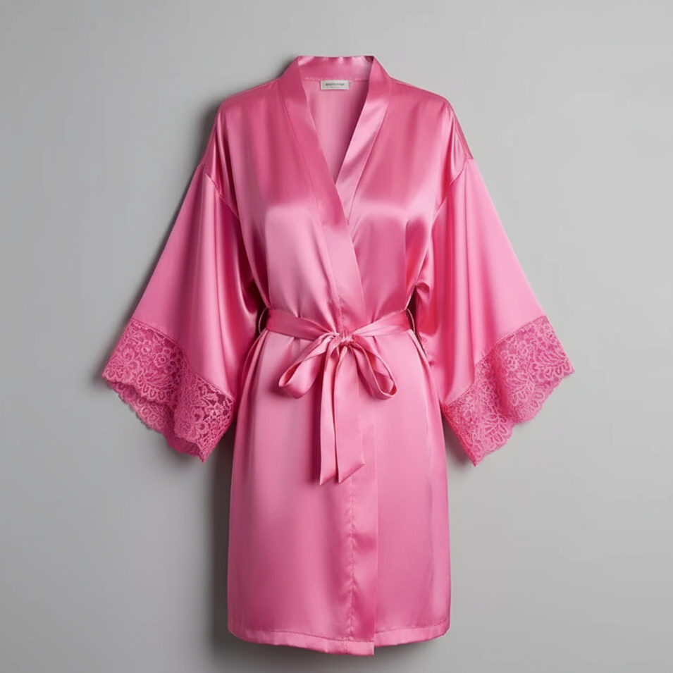 Classic wrap-style silhouette, secured with satin sash that cinches at the waist