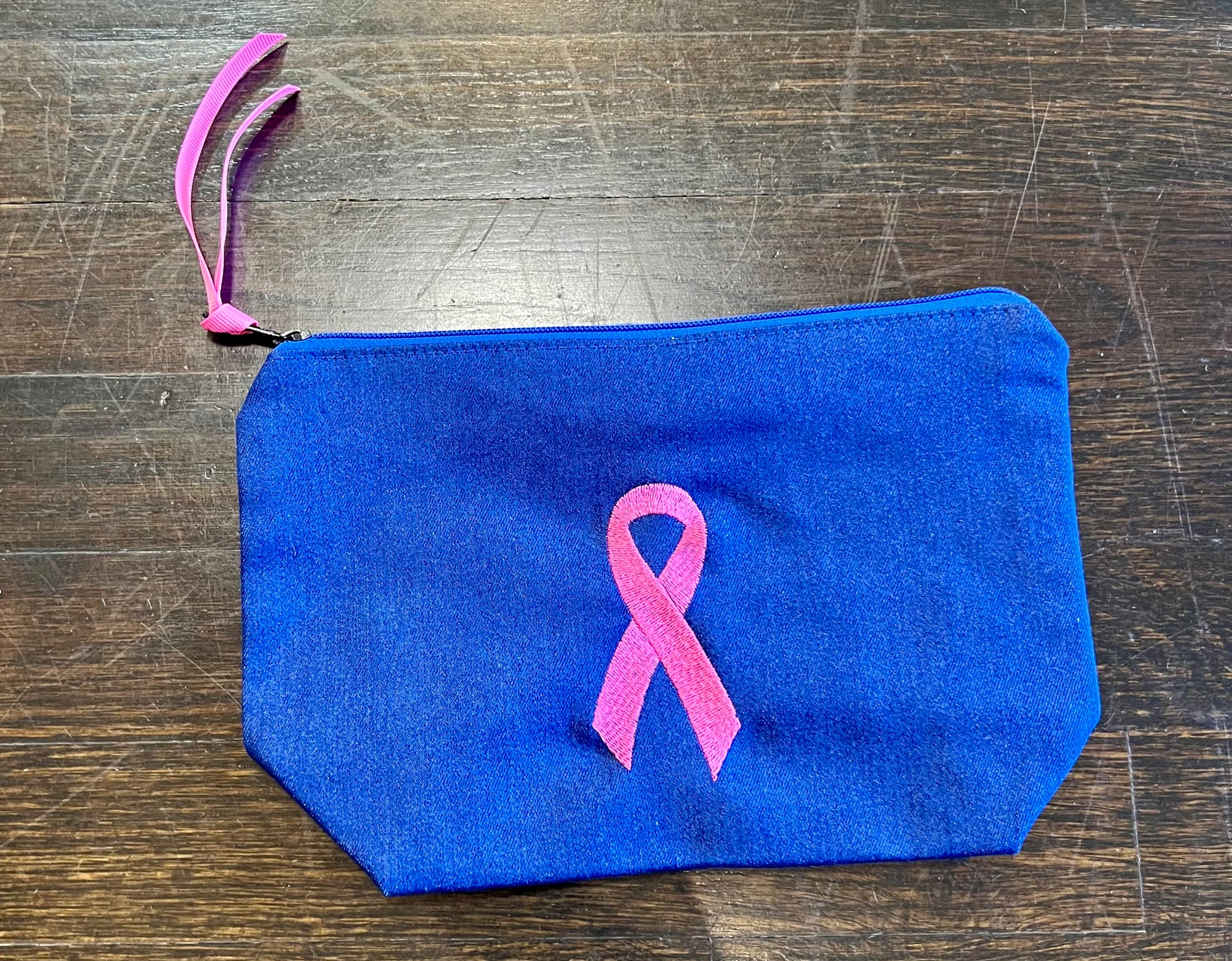 - Zip pouch with embroidered Pink Ribbon in honor of breast cancer awareness.