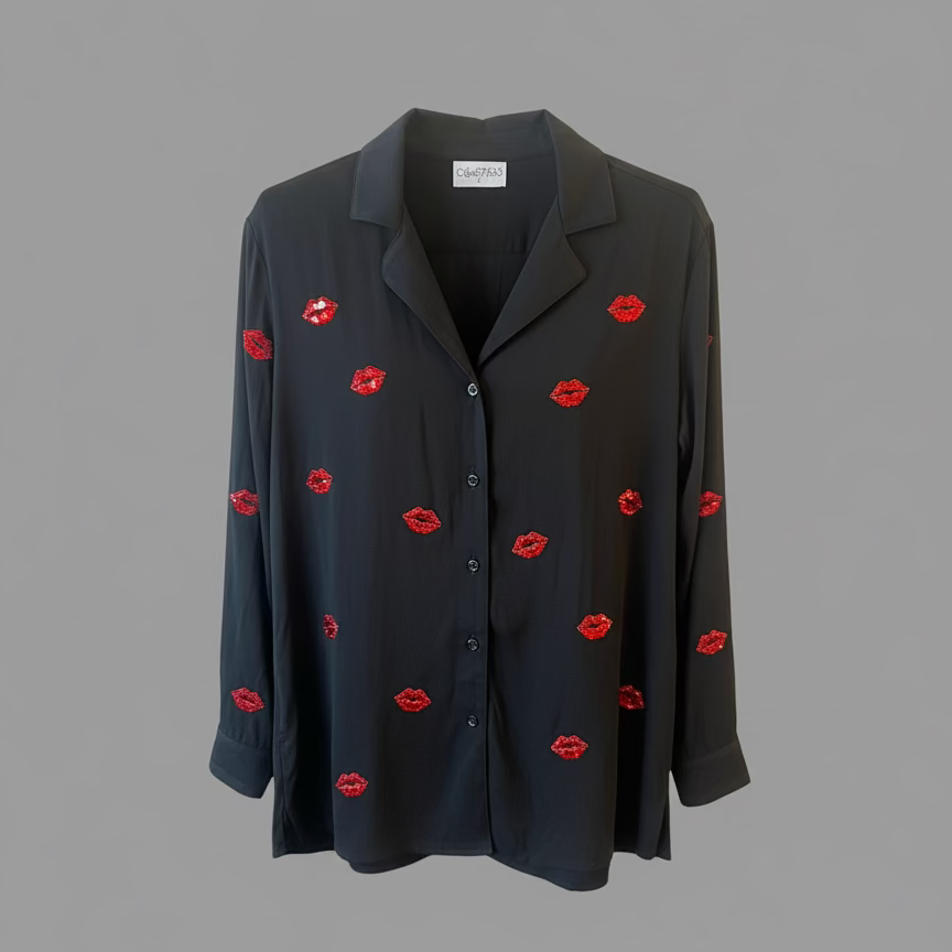 Cute and comfy button down top and pant set with bedazzled red crystal lip design