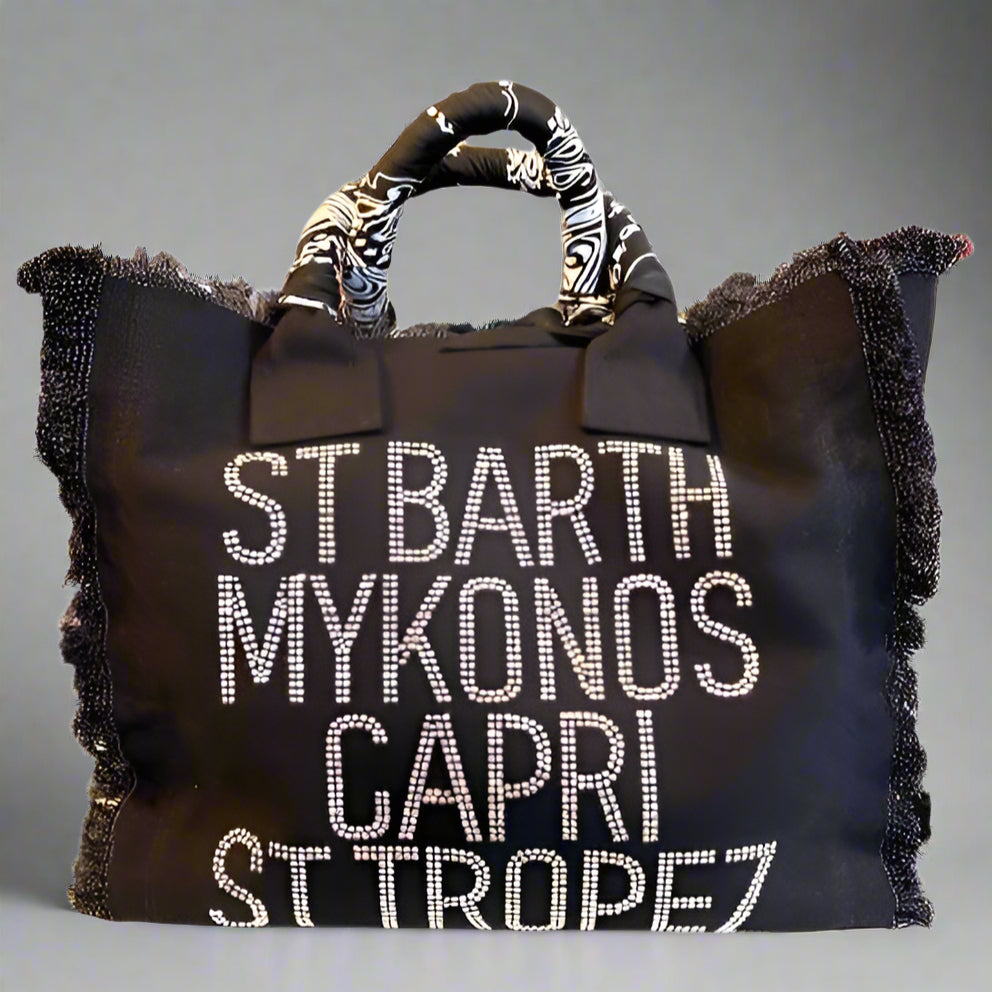 Black canvas tote with bandana wrapped handles. Adorned with silver studded summer destinations.